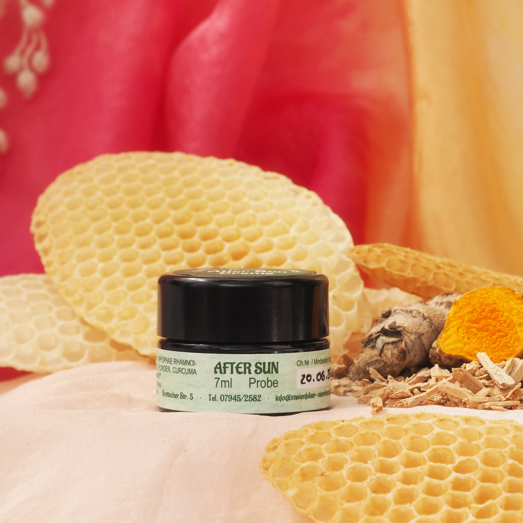 Hier holen wir wieder unsere schon bewährte 'After Sun Creme' aus dem Nähkästchen. Vor vielen Jahren, zu Zeiten des Fernsehsenders HSE, ein großer Erfolg, fragen immer noch Kunden nach dieser beliebten Creme. Es ist eine reine Fettcreme, basierend auf den Ölen von (kühlendem) Cocos, Olive und Sanddorn.