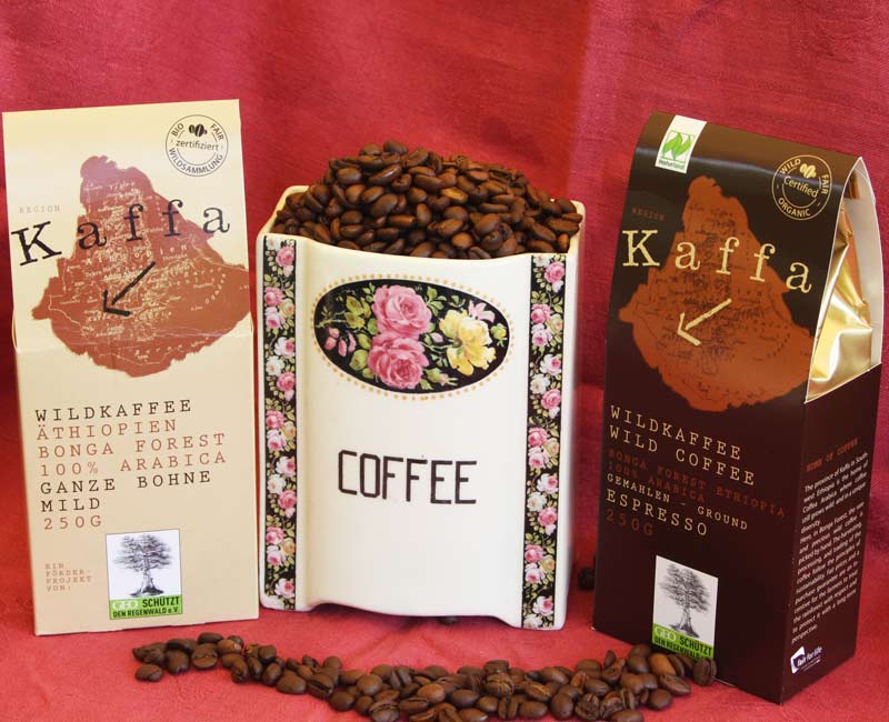 Dank eines Projektes von "GEO schützt den Regenwald ev." wächst noch heute im Schatten der großen Urwaldbäume der Wald Kaffee - in einzigartiger Vielfalt und unvergleichlicher Qualität. In der äthiopischen Provinz Kaffa/Bonga Forest, der Urheimat des Kaffees, gedeihen noch die wilden Arabica Bohnen, werden in mühevoller Handarbeit aufwendig gepflückt und zu einem der besten Kaffees der Welt verarbeitet. Durch gerechte Entlohnung entsteht ein Anreiz für die Befölkerung den Wald so zu erhalten und somit vor Abholzung zu schützen. Das einzigartige Aroma und die besondere Qualität ergibt sich daraus, dass es in den verschiedenen Waldgebieten mehr als 300 Wildsorten von Kaffeepflanzen gedeihen, jede mit eigenem Charakter, manche schmecken fruchtig, andere kräftig-herb, wieder andere leicht und blumig. Um den einzigartigen Charakter der verwendeten Lagen optimal hervorzuheben, wird er nach traditionellem Trommelröstverfahren in kleinen Chargen langsam und schonend bei ca. 200°C geröstet. - bio und fair gehandelt.