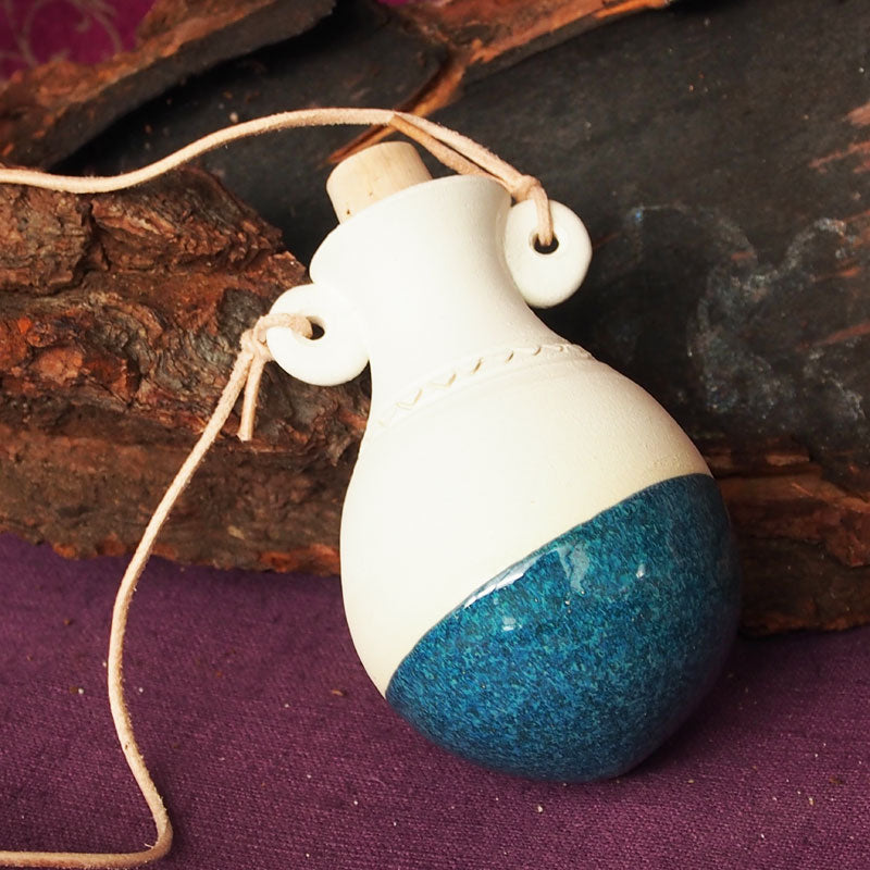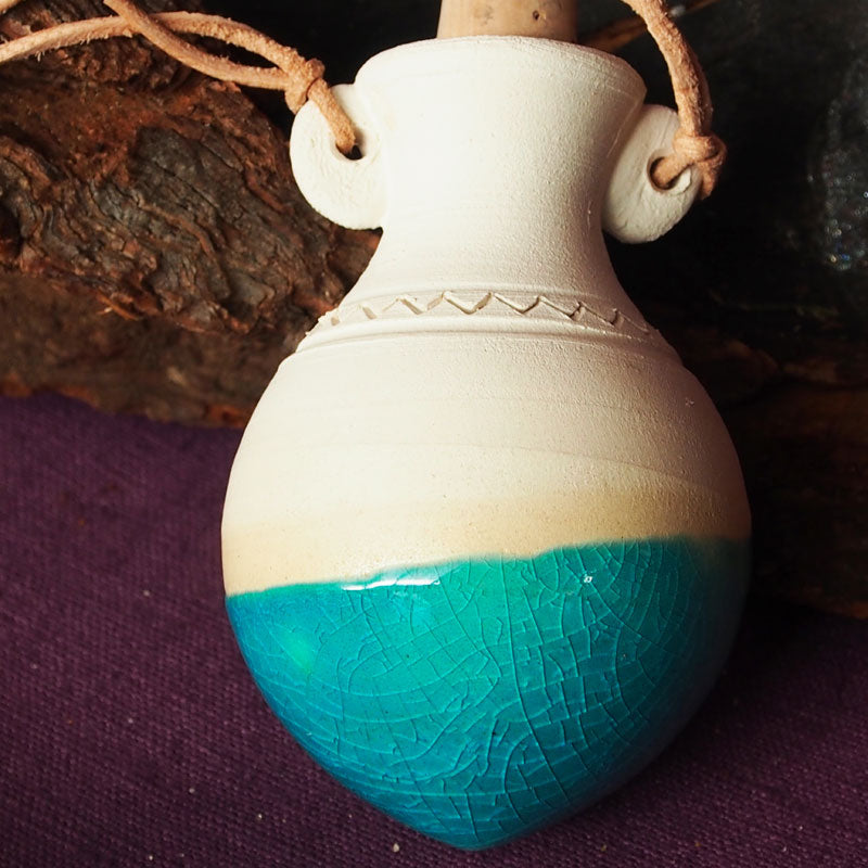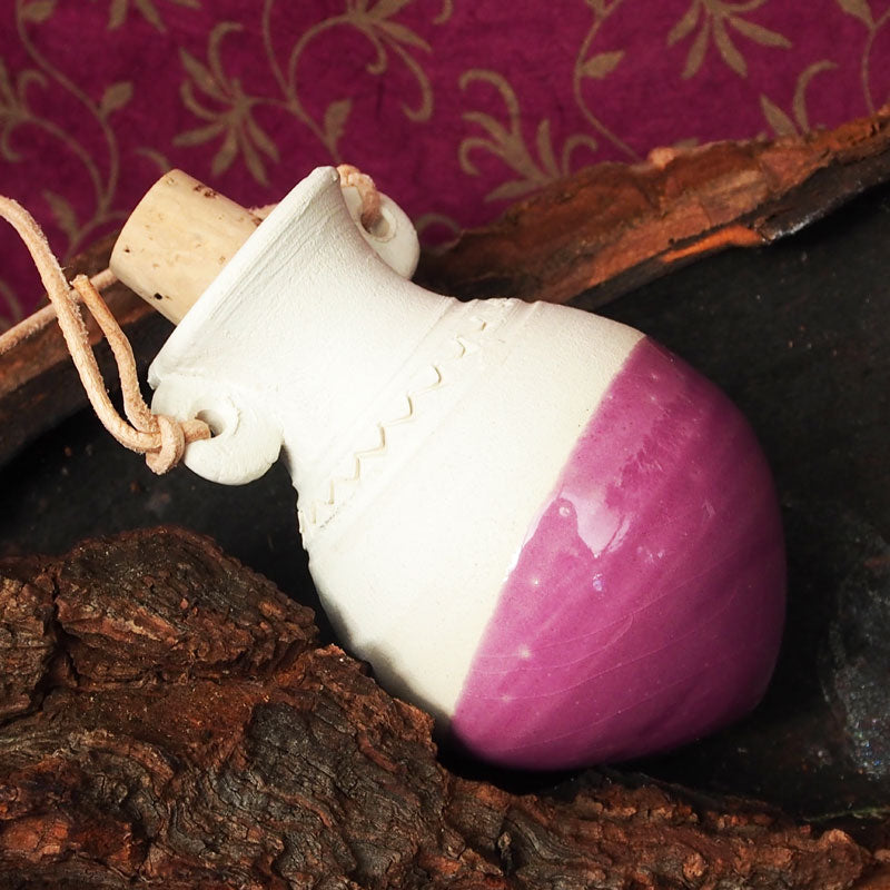 Vor langer, langer Zeit, - manche Stammkunden erinnern sich vielleicht noch daran, hatten wir schöne kleine Duftamphoren in unserem Programm. Dann wanderte der Töpfer aus und lange mußten wir suchen, bis wir einen Töpfer fanden, der die Duftamphoren nach unseren Wünschen wieder herstellt. Jetzt aktuell im Programm dürfen wir Ihnen diese kleinen Amphoren wieder vorstellen. Es gibt sie in 3 Farben. Der untere Teil ist glaciert, damit so manch dünnflüssige äther. Öl nicht durchtropft und der obere Teil ist gut geeignet um die darin befindliche Essenz - langsam aber stetig zum verdunsten zu bringen. Mitgeliefert werden auch der Korken und die Aufhängung (feine Lederschnüre).
