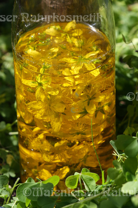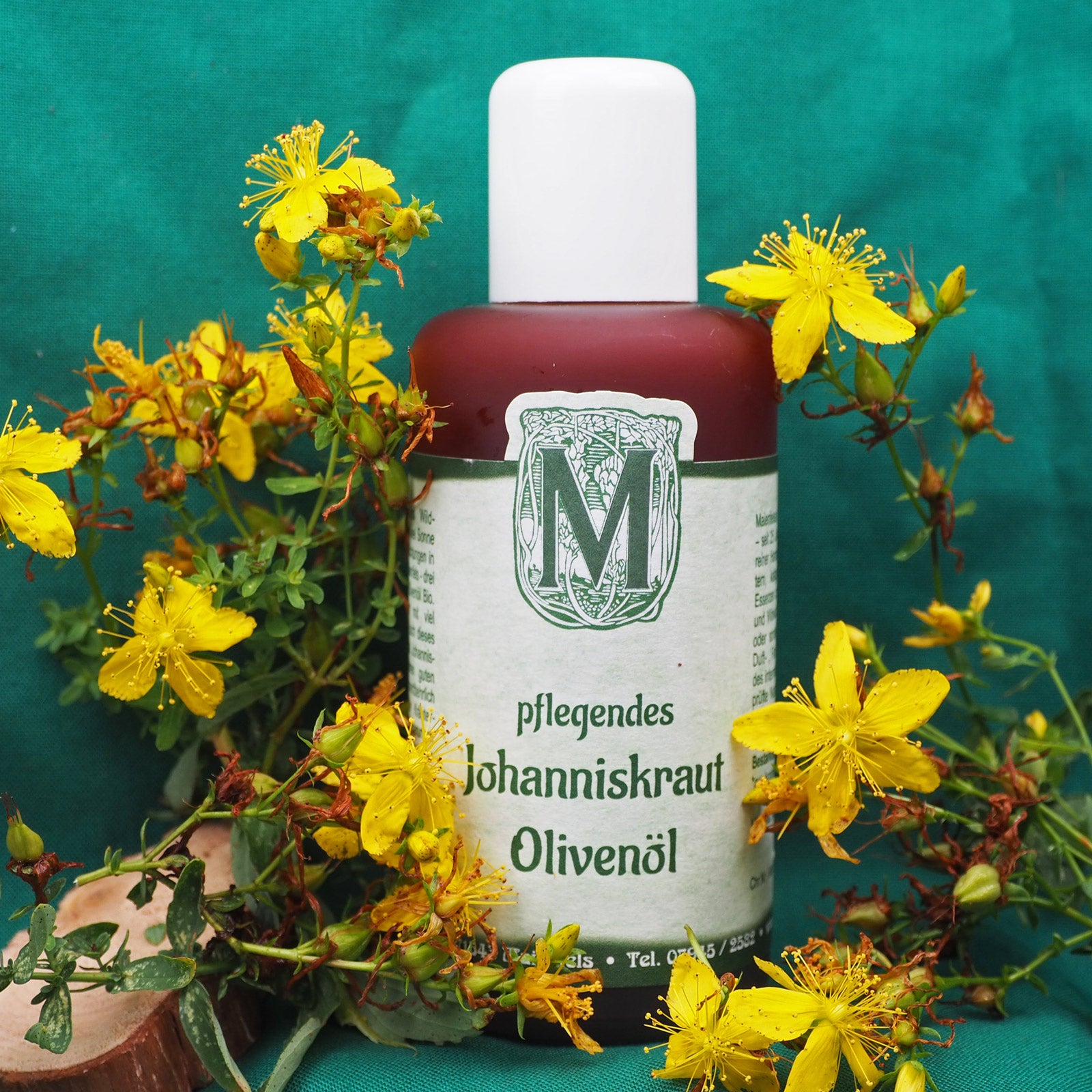 Johanniskrautblüten aus Wildsammlung gepflückt bei viel Sonne auf Wiesen und Waldlichtungen in der Umgebung von Maienfels - drei Monate angesetzt in Olivenöl Bio. Dadurch angereichert mit viel Sonnenenergie, ergeben dieses herrlich leuchtend rote Johanniskrautöl, das mit seinen guten Pflegeeigenschaften unentbehrlich geworden ist. Leichter Kräuter-Eigengeruch. Bei Ablagerungen (durch die vorher eingelegten Johanniskrautblüten) kräftig schütteln.