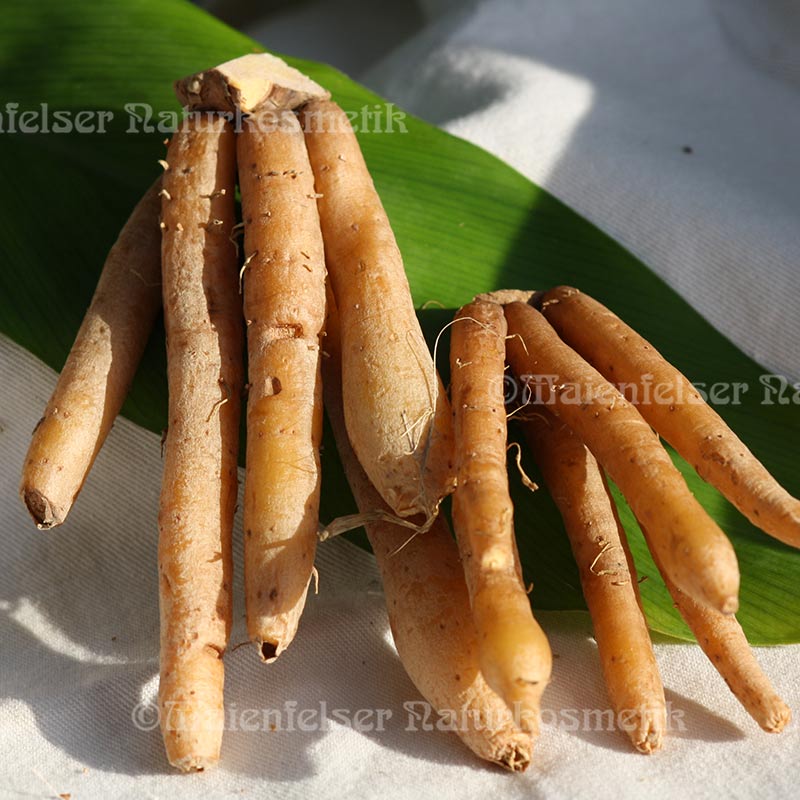 Dieses thailändische Gewächs aus der Ingwerfamilie ist im Vergleich zum tropischen Ingwer leicht als Topfpflanze zu ziehen. Das Öl wird wie beim Ingwer aus dem Rhizom gewonnen und hat einen exotischen, milden Ingwerduft mit fruchtigen Nuancen, die dünnen Seitenwurzeln werden roh und gekocht in vielen Gerichten serviert, ebenso wie die jungen zarten Blätter und Sprossen. Es hat eine schöne rosa- violette, orchideenhafte Blüte mit zartem Geruch.