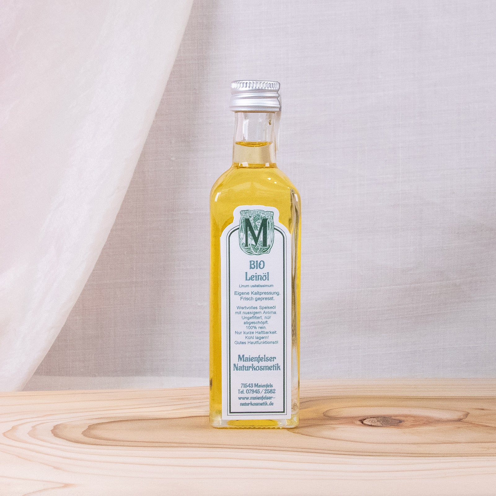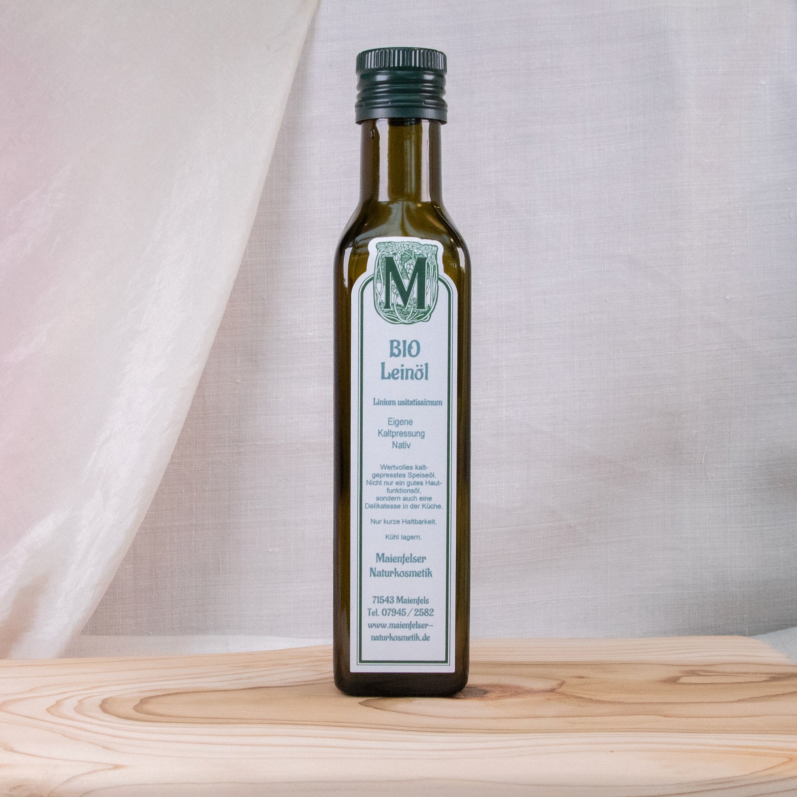 Leinöl zählt zu den wertvollsten kaltgepressten Pflanzenölen durch den sehr hohen Gehalt der wertvollen Alpha-Linolensäure. Leider zählt Leinsamenöl zu den schnell verderblichen Ölen. Schon nach wenigen Wochen bildet sich eine Bitternote, die dann stetig zunimmt und nach 8–10 Wochen das Öl nicht mehr genießbar macht. Entgegen aller Meinungen aus der Literatur schmeckt frisch gepresstes Leinsamenöl angenehm mild, nussig mit einer feinen aromatischen Note und kann als ausgesprochen wohlschmeckend eingeordnet werden. Leinöl kann man eigentlich nur direkt beim Ölmüller kaufen, eben wegen seiner kurzen Haltbarkeit. Von mir getestetes Leinöl in Reformhäusern, Bioläden oder Supermärkten ist entweder ungenießbar durch die extreme Bitternote oder schmeckt neutral nach gar nichts und ist dann raffiniert, was den hohen Gesundheitsgehalt des Leinöls vermindert. Wir pressen 1 - 2 Mal im Monat frisches Leinsamenöl - Saatgut aus biologischem Anbau. - von der goldenen Sorte, die qualitativ etwas höher liegt als der braune Lein. Bewahren Sie Ihr Leinöl kühl und dunkel auf, das erhöht die Stabilität um ein paar Tage. Aber! Altes Leinöl wird für die Holzbehandlung immer besser, je älter es ist, zur Imprägnierung von Holzmöbeln oder Holzfassaden im Außenbereich. Es bildet einen rissfreien Schutz vor Witterungseinflüssen oder im Wohnbereich als giftfreie Lasierung z. B. im Kinderzimmer. Vorsicht: Leinöllappen oder Pinsel können sich selbst entzünden. Nach Gebrauch in einem luftdichten Glas aufbewahren oder mit Seife auswaschen.