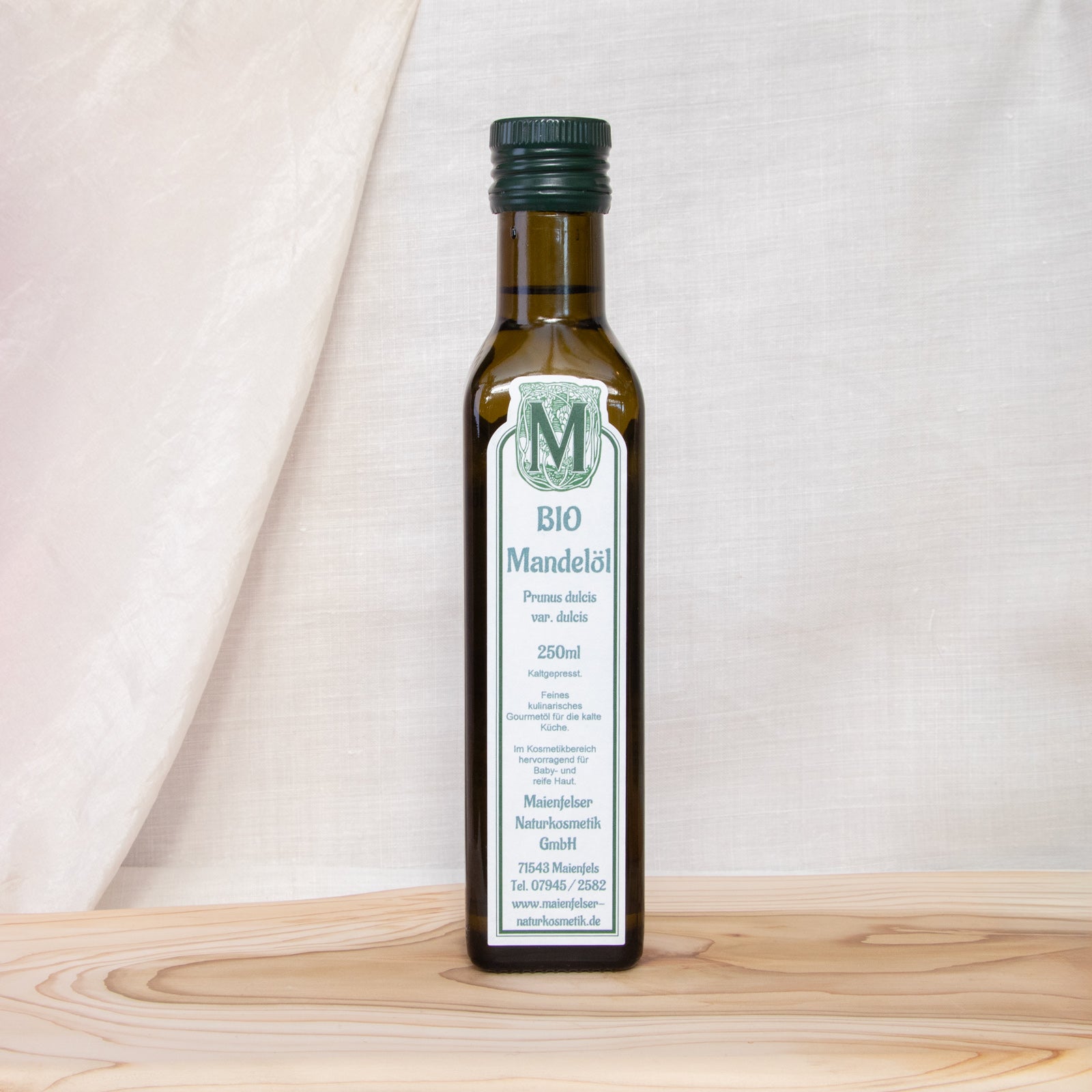 Aus den süßen Mandeln in Kaltpressung gewonnen, im Gegensatz dazu enthält das fette und auch ätherische Öl aus den Bittermandeln (Prunus dulcis var. amara) das Glycosid 'Amygdalin', besser bekannt unter dem Namen 'Blausäure',welches toxische Eigenschaften entwickelt und nicht für den menschlichen Verzehr (Gebrauch) geeignet ist.