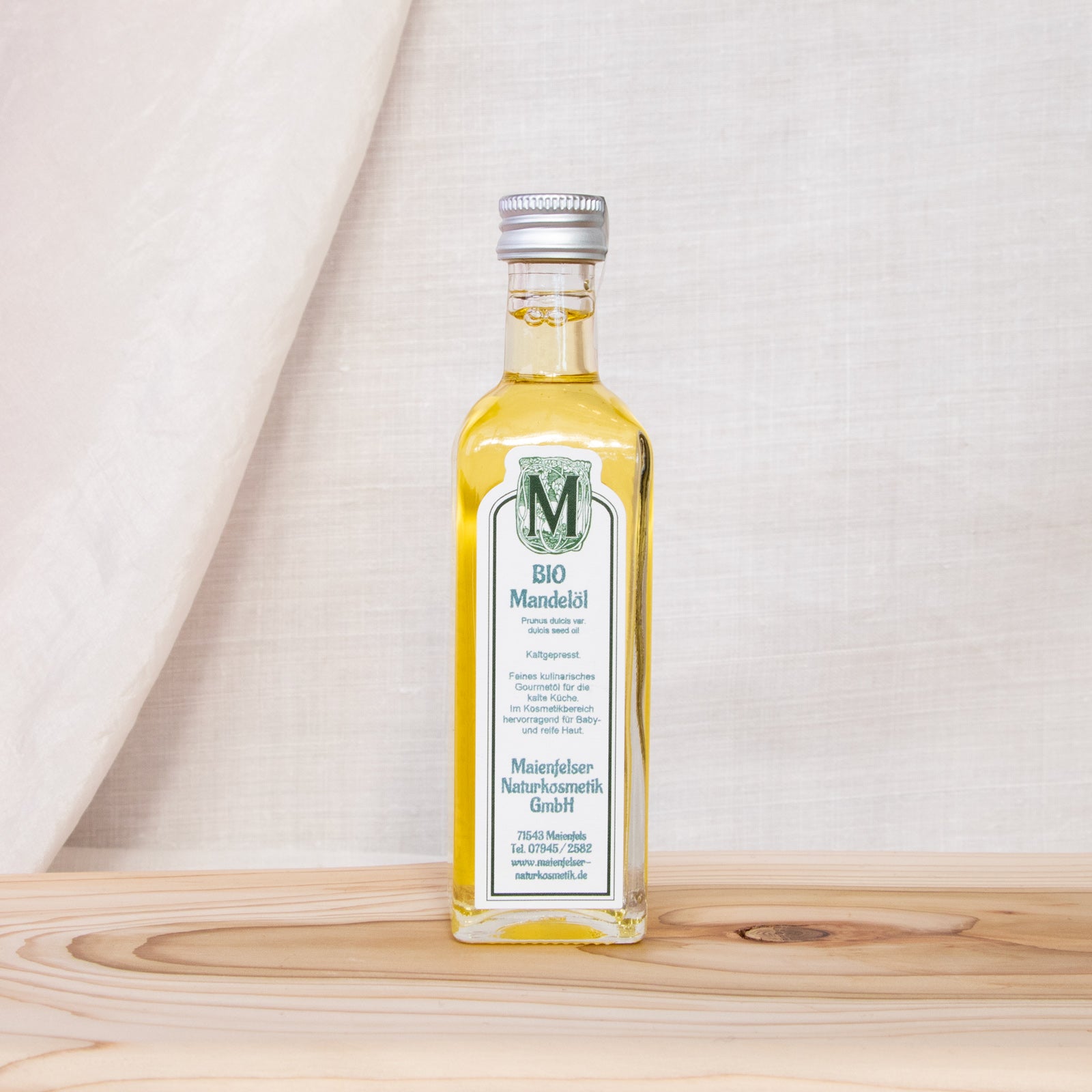 Kosmetische Verwendung: Mandelöl hat einen legendären Ruf in der Babypflege. Seine gute Verträglichkeit und sein gutes Eindringen machen es äußerst beliebt in der Pflege von sensibler und empfindlicher Babyhaut. Bei rauer, trockener und schuppiger Haut und auch bei Mischhaut und fettiger Haut mindert es den Feuchtigkeitsverlust und macht die Haut angenehm weich und elastisch. Es wirkt hautschützend, zieht schnell und vor allem tief ein und ist eine wahre Wohltat für die gestresste Gesichts- und Körperhaut. Auch als Pflegeöl bei strapaziertem, trockenem und schuppigem Haar bestens geeignet.
