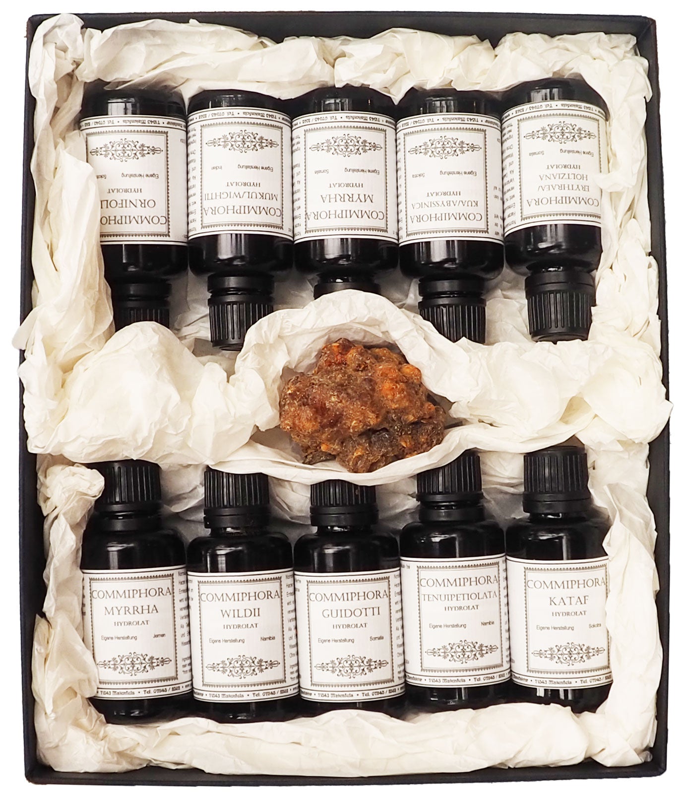 Verpackt in einer edlen schwarzen Buckram Kartonbox gibt es diese wertvollen Myrrhehydrolate nur in einer streng begrenzten, limitierten Auflage. Genießen Sie dieses außergewöhnliche Präsent.