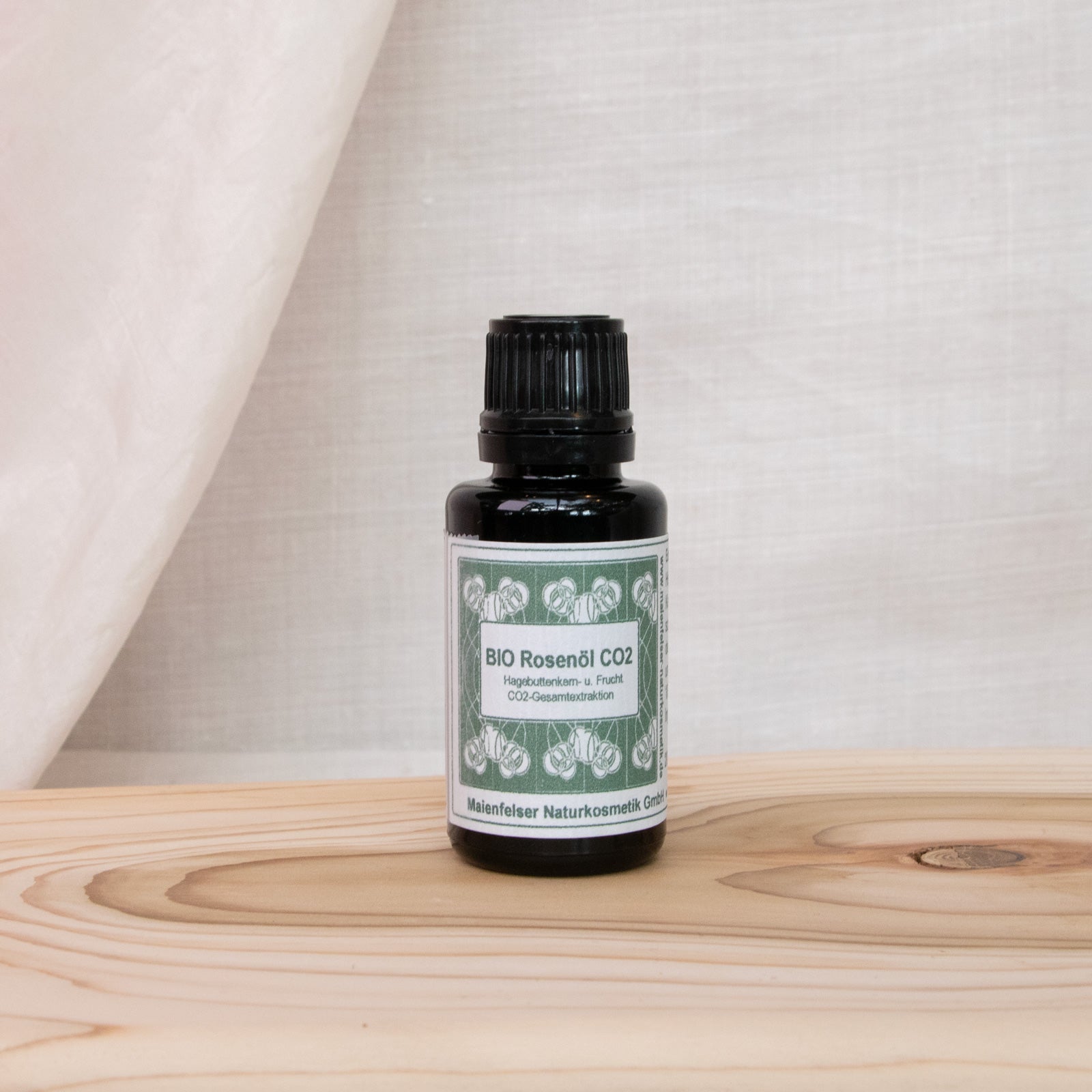 Hier wird die ganze Hagebutte extrahiert, nicht nur der Kern. Durch den hohen Anteil der Carotine in den Schalen ergibt dies ein orange-rotes Öl. Hier kann man die Ölsäure-Unterschiede, auch zu den gepressten, vergleichen.